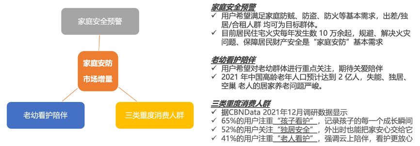 家庭基礎(chǔ)安防、老幼看護是兩大需求爆發(fā)點,是較大的市場增量所在。