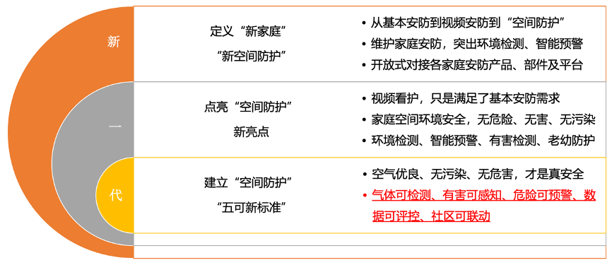 同時,點亮“六大家庭安防”場景,推出“空間防護指數(shù)”。“環(huán)境監(jiān)測”是重點,空氣污染檢測、燃氣火災(zāi)預(yù)警要突出,不定期發(fā)布“家庭空間安防指數(shù)”,從而大大提升智能居家安全衛(wèi)士產(chǎn)品的“消費號召力”。