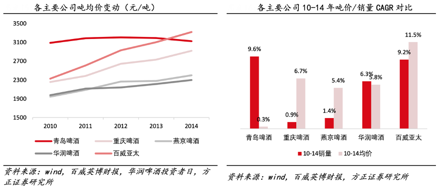 經(jīng)典案例:根據(jù)wind、百威英博財(cái)報(bào)、華潤啤酒投資者日、方正證券研究所等綜合資訊表明,百威亞太具備高端化戰(zhàn)略遠(yuǎn)見,采取高舉高打的營銷策略:通過舉辦全渠道營銷活動、跨界聯(lián)名、贊助賽事等方式建設(shè)百威品牌的高端形象,不打價(jià)格戰(zhàn)。百威中國區(qū)噸收入 10-14 年 CAGR 達(dá) 11.5%,高于同行業(yè)主要公司。百威英博亞太區(qū)域 2015 年的銷售費(fèi)用率(不含運(yùn)費(fèi))達(dá) 25.18%,高于啤酒行業(yè)其他公司。