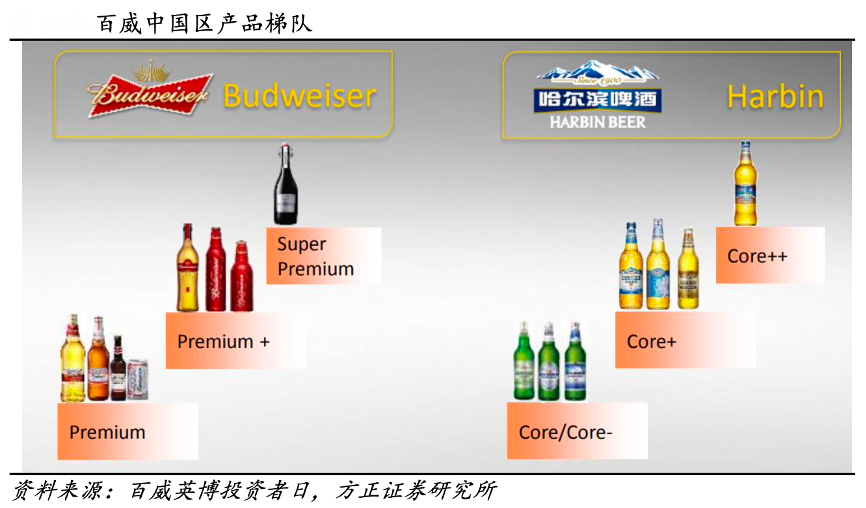 經(jīng)典案例:根據(jù)百威英博投資者日、方正證券研究所等綜合資訊表明,百威亞太“升級包裝+推出創(chuàng)新性產(chǎn)品”推動高端化,公司通過推動哈爾濱冰純(2006 年推出)在哈爾濱啤酒家族(清爽、冰暢、冰爽定位核心價(jià)格帶)中占比提升來推動核心到核心+價(jià)格帶的升級。公司 12H1 到 15H1 整體均價(jià)提升 CAGR +9%,90%由產(chǎn)品結(jié)構(gòu)變動貢獻(xiàn);10%由提價(jià)貢獻(xiàn)。