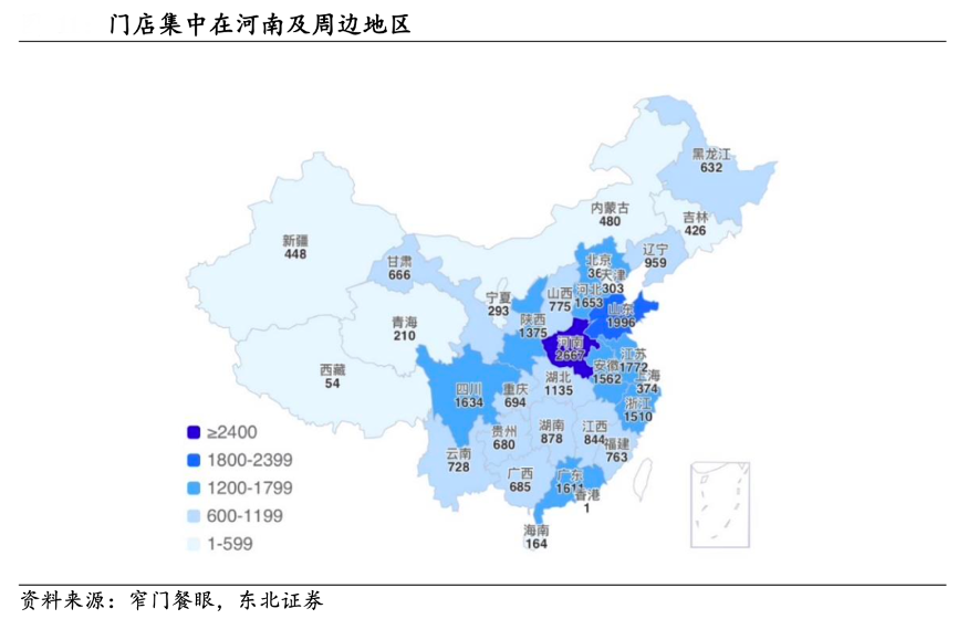 經(jīng)典案例:根據(jù)公司官網(wǎng)、窄門餐眼等綜合資訊表明,結(jié)合極海品牌監(jiān)測(cè)數(shù)據(jù),分線級(jí)城市來(lái)看,蜜雪冰城集中在三線及以下城市,三至五線城市合計(jì)占比 56.41%,一線城市僅占 4.88%,與公司主打性價(jià)比路線有關(guān)。分線城市收入結(jié)構(gòu)更類似于華萊士,但更加下沉。分區(qū)域來(lái)看,蜜雪冰城門店主要集中在河南、河北、山西、陜西、四川及廣東等地區(qū),華南與華西門店較少,同時(shí)公司積極拓展華東市場(chǎng),江浙兩省門店超千家。