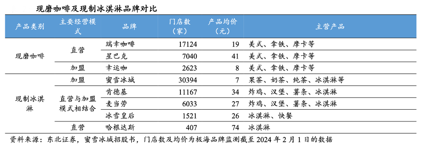經典案例:根據東北證券、蜜雪冰城招股書、極海品牌監測數據等綜合資訊表明,蜜雪冰城是平價市場的絕對龍頭,根據窄門餐眼數據,截至到 2024 年 2 月 1 日,蜜雪冰城門店數約 3 萬家,遠超現制茶飲其他品牌,而產品均價 7 元,在現制茶飲行業價格優勢顯著。