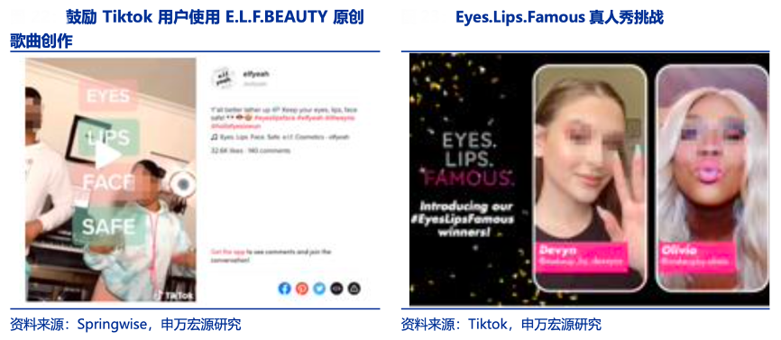 經典案例:根據Springwise、Tiktok、申萬宏源研究等綜合資訊表明,2019 年,TikTok 成為最熱門的新 平臺,但參與其中的美妝品牌卻寥寥無幾。E.L.F. BEAUTY 發現空白新渠道,并在 Tiktok 上發布原創品牌歌曲,鼓勵用戶使用帶#EyesLipsFace 的背景音樂進行創作,收獲首批 Z 世代消費客群。公司緊接著發起 TikTok 真人秀挑戰 #EyesLipsFamous,以 TikTok 頂級 影響者、專業化妝師等的指導及為期一個月的“美容營”作為獎勵,號召用戶分享加入, 此次挑戰收獲了 3.8 億瀏覽量,品牌粉絲數量激增 57%。