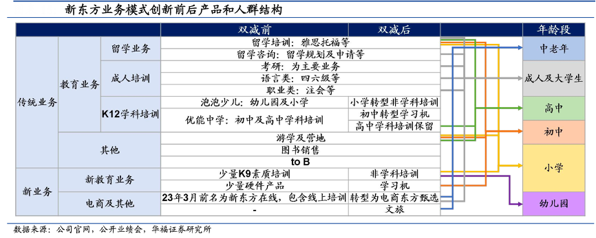 經典案例:根據公司官網、公開業績會、華福證券研究會等綜合資訊表明,新東方新業務中電商和文旅部分,則是以新東方大 IP 為基礎,迎合學生及家長的多層次需求,向上進行年齡層的延伸,一方面直接為公司貢獻增量業績,另一方面助力集團進行商業版圖的擴張。