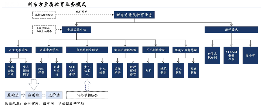經典案例:根據公司官網、投中網、華福證券研究會等綜合資訊表明,新東方素質教育的業務分為素質成長中心和游學營地兩大板塊,提供豐富多樣的教學 內容,創新教育模式,旨在培養孩子的多元化能力。其中的素質成長中心結合線上線下 模式,通過免費試聽課程吸引顧客,包括人文發展學院、語商素質學院、自然科創空間站、智體運動訓練館、藝術創作學院和優質父母智慧館六大領域。