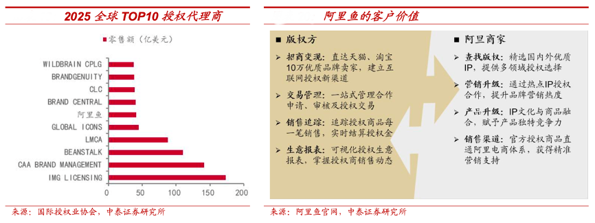 經典案例:根據國際授權業協會、阿里魚官網、中泰證券研究所等綜合資訊表明,阿里魚為阿里巴巴旗下在線版權交易服務平臺,為國內外版權方和優質品牌商家,提供一站式互聯網授權方案。以大數據匹配為核心,包含授權交易、授權管理、 聯合營銷、在線銷售、自動分賬等服務。阿里魚為 IP 方提供變現新渠道: 直達 10 萬精選品牌和 4.34 億活躍買家。