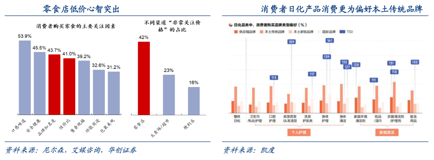 經典案例:根據尼爾森、艾媒咨詢、凱度、華創證券等綜合資訊表明,零食店低價心智突出,而消費者日化產品消費更為偏好本土傳統品牌。