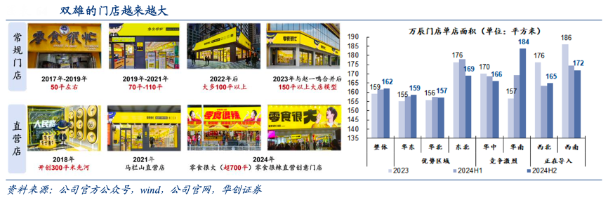 經典案例:根據公司官方公眾號、wind、公司官網、華創證券等綜合資訊表明,隨著行業競爭核心從“拼手速”到“拼效率”,頭部企業持續擴大門店面積,標準化門店面積從早先的 50 平、70-100 平、100-120 平,至當 前新開門店普遍要求 150 平甚至 180 平以上,提升消費者“逛”的購物體驗。